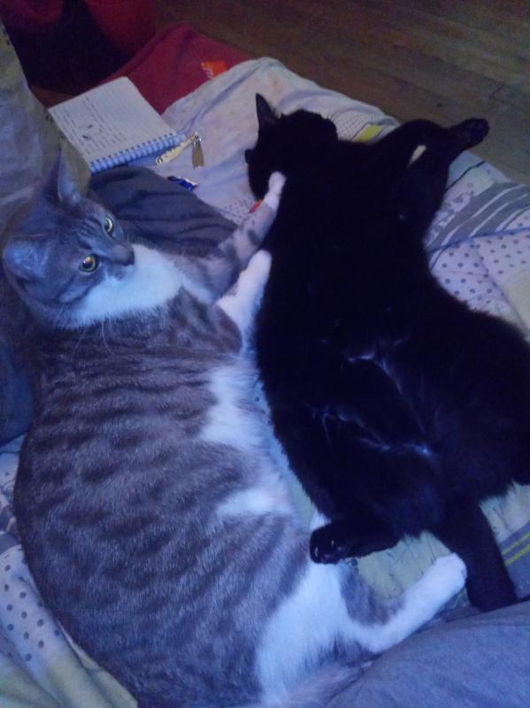 Voilà ce matin, un de mes deux chats, le gris et blanc, a disparu. La porte de mon appartement était ouverte, je ne sais pas pourquoi ni comment et un de mes deux chats est parti et a dû aller dans la rue car la porte de l'immeuble était restée ouverte aussi!!