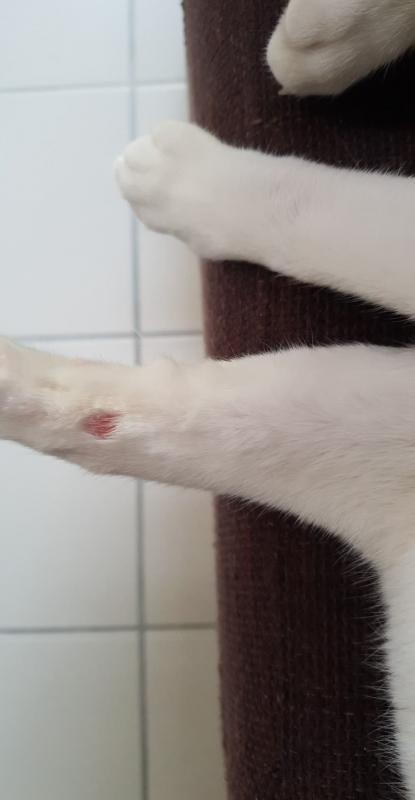 "Ma louloute a eu une plaie similaire il y a peu, et pareil, j'ai paniqué en songeant à la teigne. Mon véto m'a donné un truc tout simple pour vérifier si c'est la teigne ou non, il m'a dit qu'il fallait tirer un peu sur les poils sur le pourtour de la plaie. Si ça part en touffe : C'est la teigne. Si ça ne bouge pas ou peu, c'est simplement une "lésion de grattage". Et la teigne fait des espèces de plaques aux bords parfois rougeâtres, je ne crois pas qu'elle puisse faire des "traits" aussi définis au milieu des rosettes sans poil."