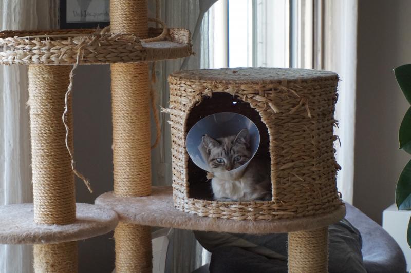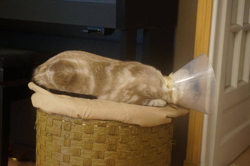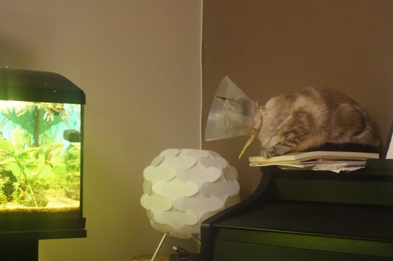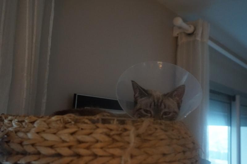 il faut que je prenne quelques galets. Ca va bientôt être la bonne période dans les magasins. Bref, elle fait bien avec sa collerette. Parfois, elle s'énerve quand elle essaye de se gratter la tête et qu'elle n'y arrive pas ! mais elle a déjà réussi à passer une patte arrière pour se gratter le museau !