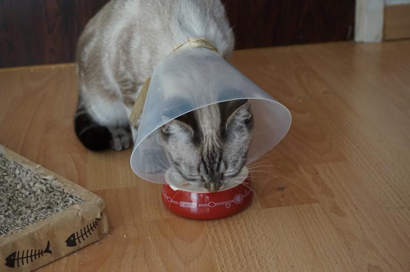 J'ai eu un doute ce soir sur la taille de collerette, et son système d'attache empêche de la raccourcir, alors je suis retourné au magasin avec Odyssey. La vendeuse m'a bien rassuré, elle peut manger avec sa collerette.