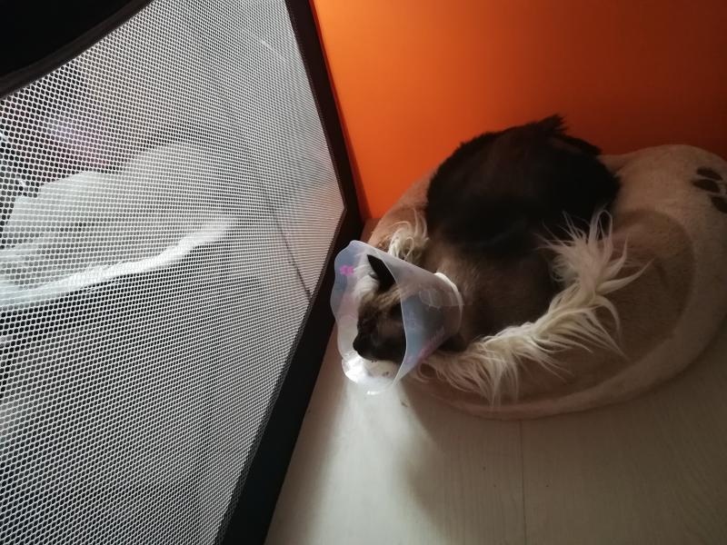 Bonsoir ça va, elle reste au parc sans râler, elle sait enfin manger avec sa collerette