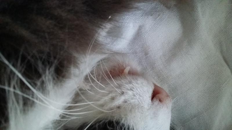 hier matin il est parti poursuivre un gros chat et quand il est revenu j'ai vu quelque chose qui pendant dans le coin de sa bouche