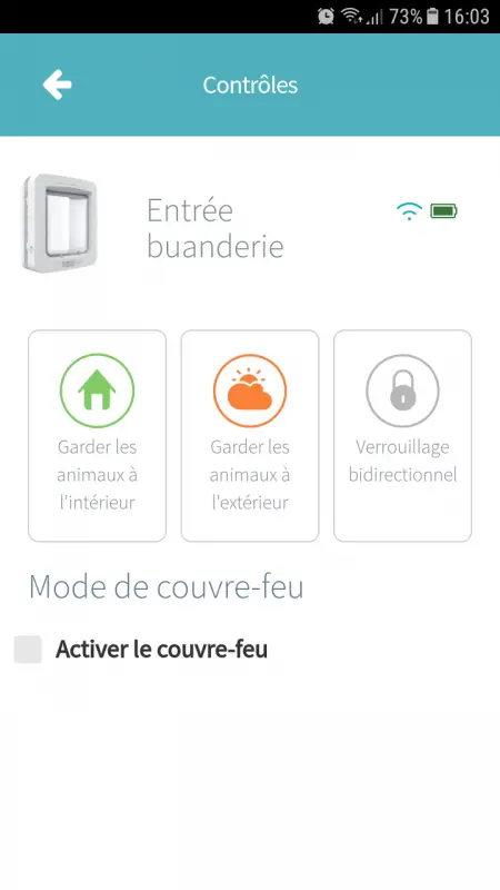 L'application sur smartphone permet aussi de contrôler la chatière : l'ouvrir, la bloquer, laisser uniquement entrer les chats, laisser uniquement sortir les chats. Il y a également la possibilité de programmer un couvre-feu (à partir de telle heure, les chats pourront entrer mais ne pourront plus sortir jusque la fin de couvre-feu). On peut également programmer tout ça directement sur la chatière.