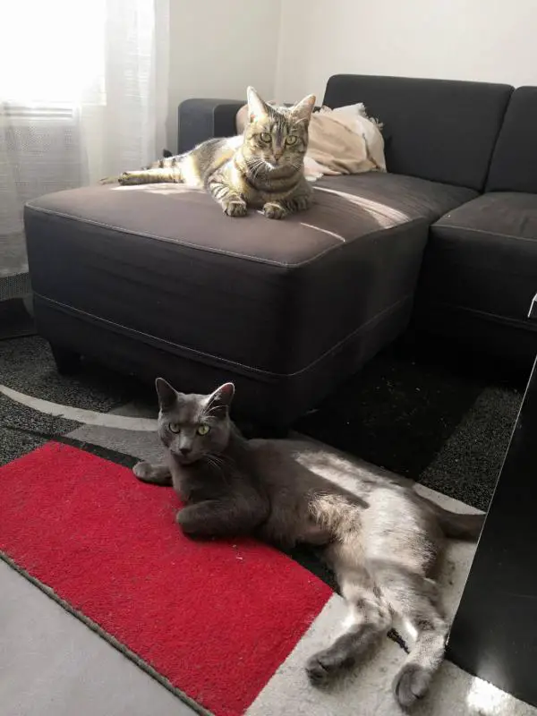 Encore quelques petites bagarres de coups de pattes dans l'escalier (l'un aime bien empêcher l'autre de monter/descendre et vice/versa) mais sinon tout est ok.