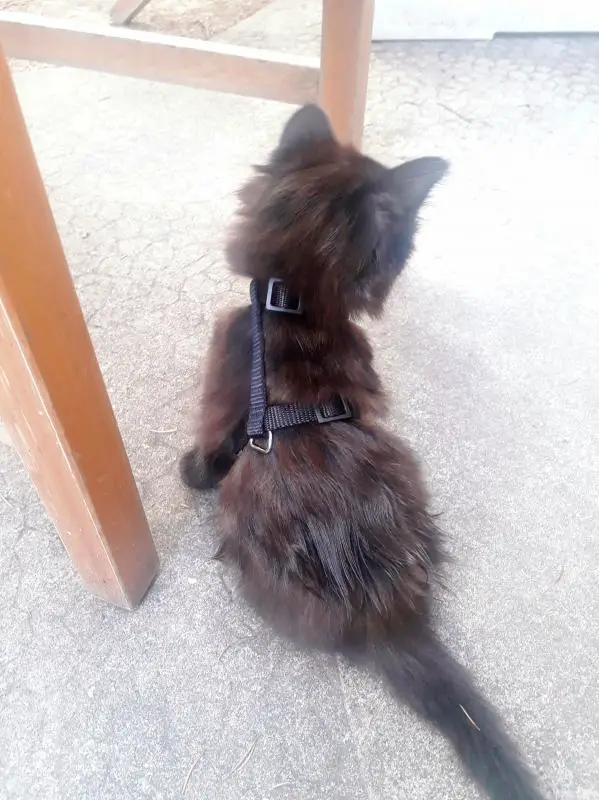 Mais décidément tout ce qu'il me semblait compliqué de lui apprendre (la litière, le sac de transport, le harnais...) n'a besoin que d'une seule leçon pour être aussitôt intégré par la minette !