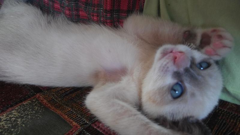 c’est simplement un chat de gouttière colourpoint . le corps est beige avec les extrémités colorees (au niveaudes parties corporelles froides) aux yeux bleus.
