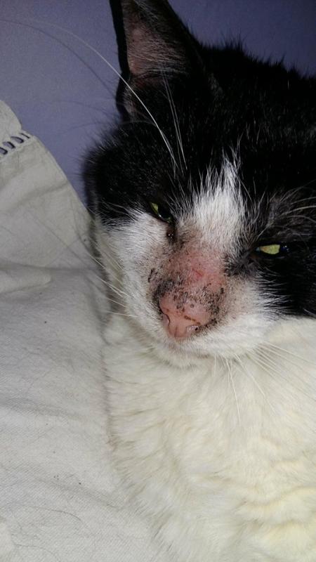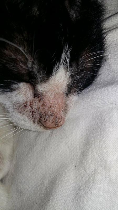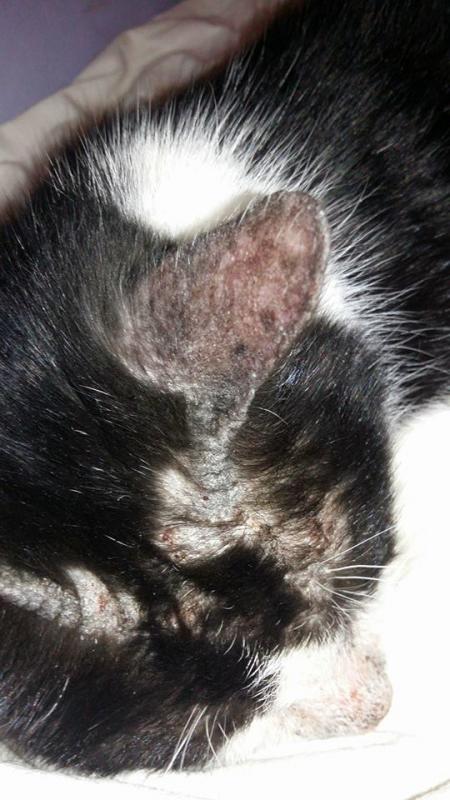 Je suppose que le vétérinaire a écarté l'hypothèse de la gale dites "de corps"? Cela dit, la gale est rarement aussi localisée. Là on dirait que c'est vraiment la tête qui est touchée.