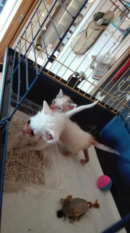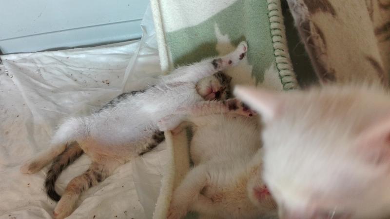 J'ai envoyé la vidéo à ma clinique, la véto m'a tel, elle n'a jamais vu ça elle est impressionnée par une tels violence. Elle m'a dit de séparé les plus fétiche. De tentée lait et pâtée mélanger. J'ai essayer ce soir, mes ils refuse de lapper. Donc j'ai donnée un peu biberon, leur aient retiré et présenter pâtée, deux acceptent juste de manger dans ma main et le tigres coupelle. Les plus fétiche j'ai pas donnée car la véto dit de faire attention changement brutal ça va être lourd a leur petit estomac. Pour les hématomes faut que je lui mette pommade arnica