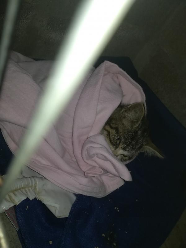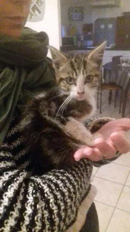 Bonsoir hier soir ma sœur m'envoi un mp disant qu'elle a trouvé un chaton, elle me l'a rapportée cette après-midi car elle travailler ce matin. Il est en triste état, amaigri, fièvre, diarrhée et il a très mal au ventre. J'ai donnée des son arrivée tolfedine, felidiarix. Il a bu et là 2 heures après il a mangé la tolfedine fait son effet. C'est un P'tit courageux qui veut vivre.