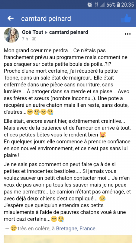 Le lien ne fonctionne pas mais en fonction du département, il y a pas mal d'assos qui peuvent aider. Sur Rennes, il y a bêtes de scènes, dans le finistère, le refuge de Landerneau, l'Arche De Noé, les Alfrèdes. Il serait bien de savoir qui les garde dans ces conditions. Je veux dire, tant de monde fait du marchandage à l'adoption urgente en menaçant de mort ou de mauvais traitements... S'il y a adoption c'est qu'il a contact avec la personne responsable de ces chatons.