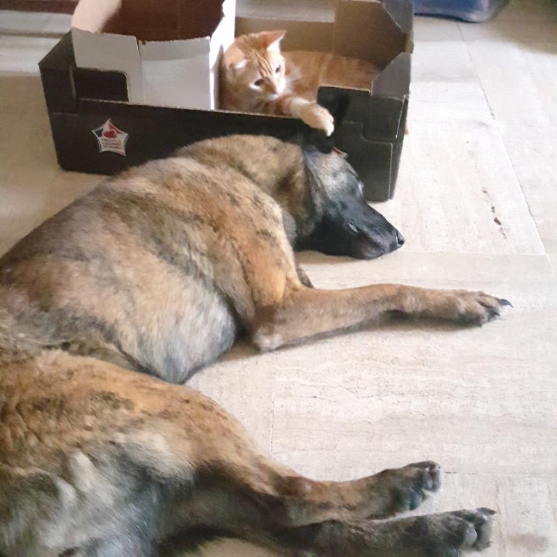 Elle s'entend très bien avec le berger hollandais... d'ailleurs, quand on donne les croquettes au chien, elle vient en manger quelques unes avec... la chienne la laisse en prendre et manger à côté d'elle. De même, lorsque je donne a manger à la chatte (en laissant sa gamelle au fond de sa boite de transport ouverte pour que la chienne ne vienne pas d'un coup de langue tout lui manger, j'en laisse toujours tomber exprès par terre pour que la chienne se réjouisse quand je nourris Savane.
