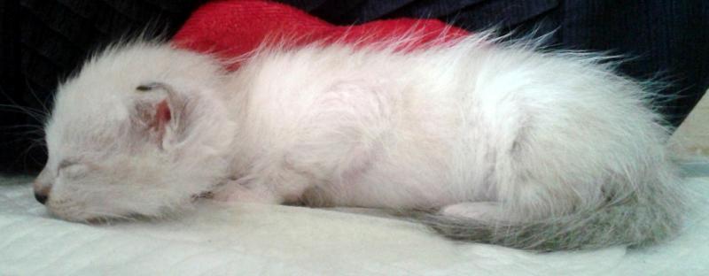 Pour la couleur, je ne sais pas ce que ça va donner car au début il parait qu'il était blanc et c'est vrai qu'il semble foncer aux extrémités, sauf le bout des pattes... queue, nez, oreilles, cuisses deviennent grisonnantes... en tous cas, il ne ressemble pas du tout à la mère, il doit tout tenir ses gènes du père vu la différence, à part la taille peut-être, comme la mère était de petit gabarit et que lui il pesait 180 grammes à 1 mois... je n'arrive pas à imaginer qu'il puisse devenir un gros chat.