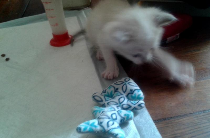 Plume a bien grossi, on a dépassé les 300 grammes !! C'est impressionnant ... il avait peut-être le ventre encore très plein car il ne fait pas ses selles souvent malgré les stimulations... Il commence a bien jouer, à être plus à l'aise pour bouger, il mordille et miaule dès qu'il veut manger ou sortir... ça devient un vrai chaton avec beaucoup de caractère qui s'acharne avec dents et griffes sur la tétine... il retrouve la forme et je le découvre plus déterminé à vivre en force.... je pense que c'est cette volonté et capacité de s'acharner à avoir ce qu'il a besoin qui lui a permis de vivre le premier mois quand les autres n'ont pas pu survivre.