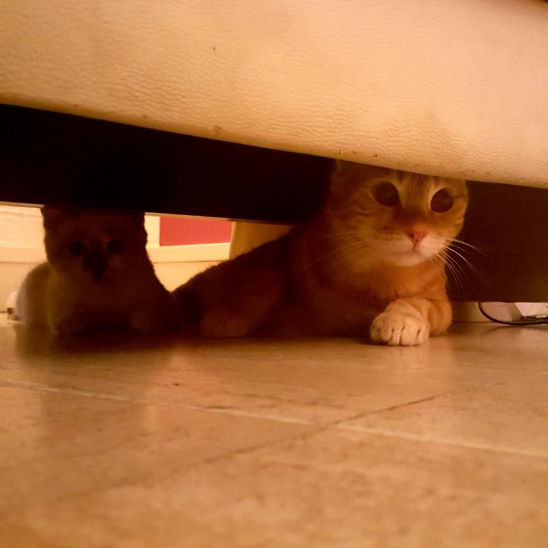 C'est exactement ça, ils étaient en train de sauter partout sur le canapé, c'était mignon et je voulais essayer de les photographier mais j'avais fait plusieurs fois des" tut tut" (bruits de bouche) pour les calmer car j'entendais des bruits de griffes dans le cuir du canapé... alors je m'approche pour voir avec l'appareil en main et zoup ! Les filous sont partis se cacher dessous...
