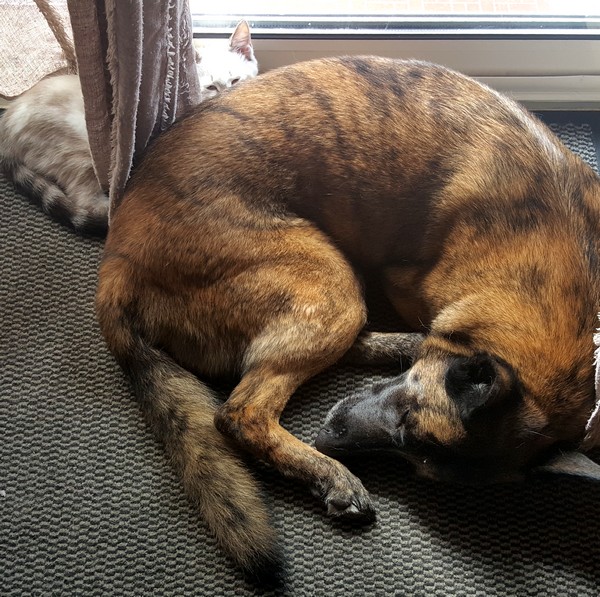 PlumEddy a choisi Savane pour jouer et la chienne pour dormir. Voilà que je le retrouve tout rontonnant contre la chienne ::lover::