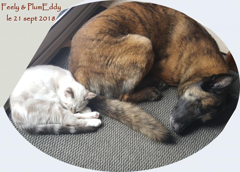 Finalement oui :::203::: , je trouve que Savane est beaucoup plus heureuse et paisible avec lui, elle n'avait jamais pu jouer "chat" de sa vie puisque je l'avais trouvé au premier jour de sa vie, pas de contact maternel non plus, et là, elle découvre des instincts, elle est hyper maternelle et tendre avec lui, elle miaule s'il monte à l'étage comme pour me prévenir qu'il va faire une bêtise et qu'elle ne peut plus le gérer, De plus Plumeddy a même créé une belle relation avec la chienne, ils se lèchent mutuellement les oreilles, c'est super chou... le chaton se frotte à elle quand elle est couchée et après plusieurs passages, il se couche tout contre elle, au chaud et je crois qu'elle est très heureuse d'autant d'attention car elle a toujours eu une nature excessive dans ses démonstrations affectives. Si je donne un reste à la chienne, meme un bout de pain dur, elle est toute fofolle de bonheur et part toute fière le manger sur le tapis, mais elle ne dit rien à ¨PlumEddye qui vient lui manger tout ce qu'il peut entre ses pattes, sous elle, pas un grognement, pas un agacement... et puis il faut voir la flamme quand ils se regardent, c'est plein d'amour ::lover:: ... alors comment ne pas le garder ce petit chat ? Meme si ça ne m'arrange pas d'avoir un chat de plus, c'est vraiment un amour... et tout le monde serait plus triste s'il n'était pas là ! ::goood::