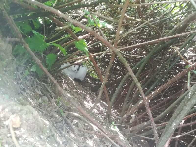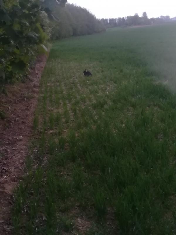 Ce midi mon tel sonne, la bénévole qui me dit qu'elle est aller promener ses chiens sur un chemin aménagée pour promenade et elle y a vu un chat. Aussitôt je la rejoint, je tombe sur un lapin nain